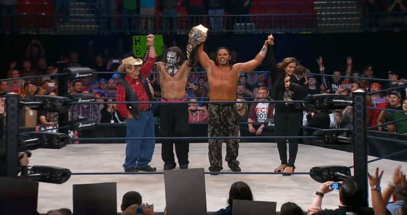 Hardy infamously won the TNA WHC this past weekend at Bound for Glory in a triple threat match with Ethan Carter III (EC3) and Drew Galloway. With some help from his brother/special guest referee, Jeff, Matt won the title. EC3 was upset with the unfair play and is now (kayfabe) suing TNA and Matt Hardy. As a result, Hardy elected to drop the title.